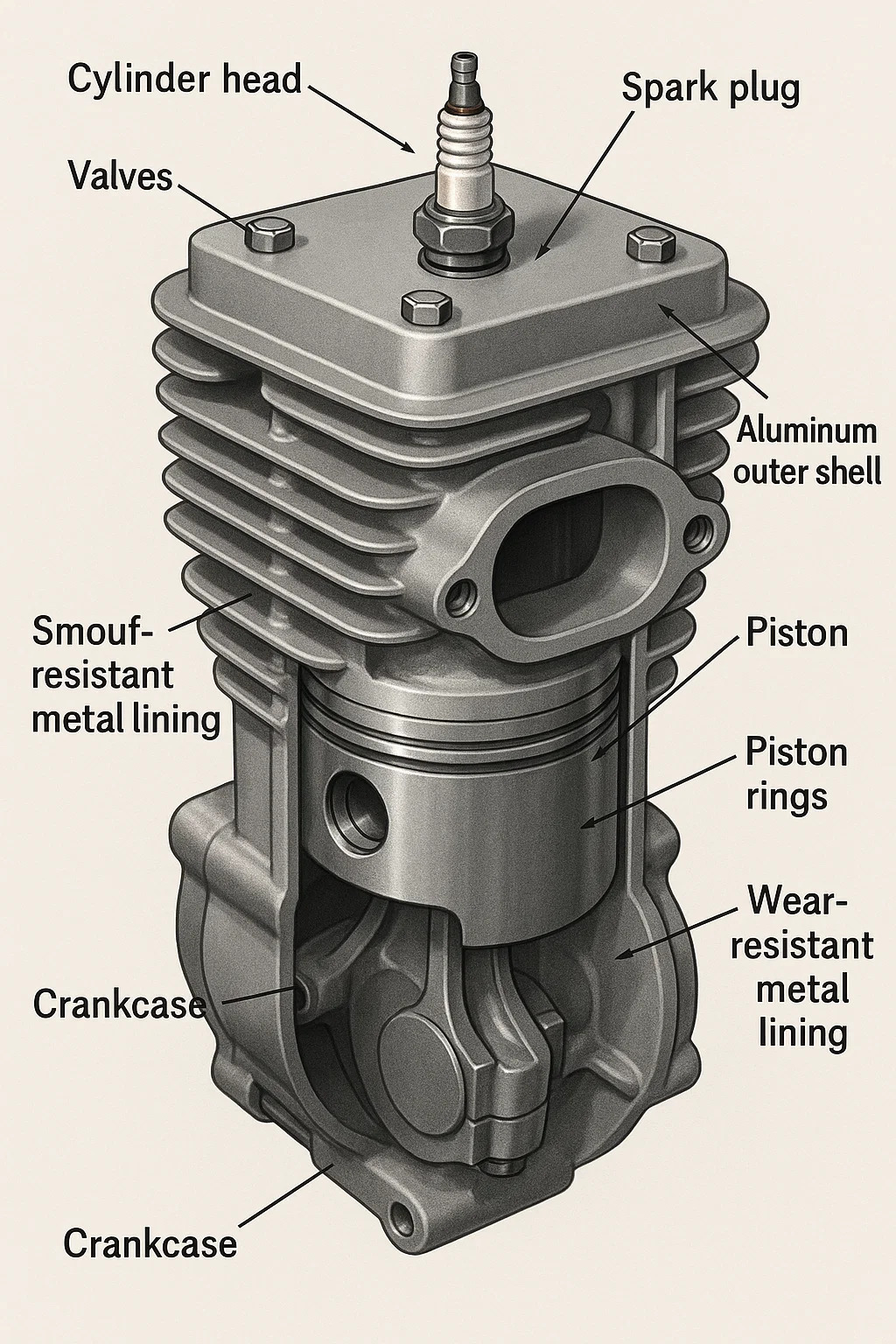 Zwykle ma aluminiową powłokę zewnętrzną (lekką, szybko odprowadzającą ciepło) z odporną na zużycie metalową wyściółką wewnątrz (taką jak powłoka niklowo-silikonowa lub żelazna wkładka), aby zapobiec zużyciu tłoka.